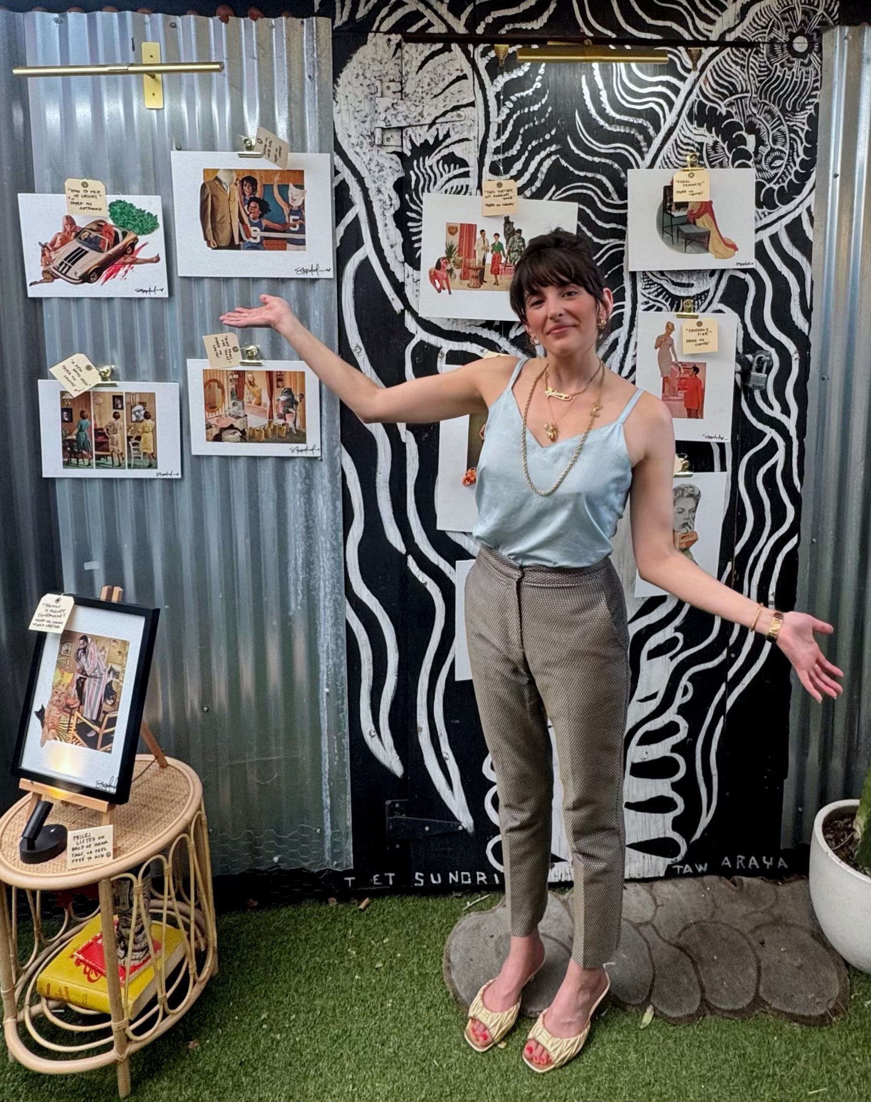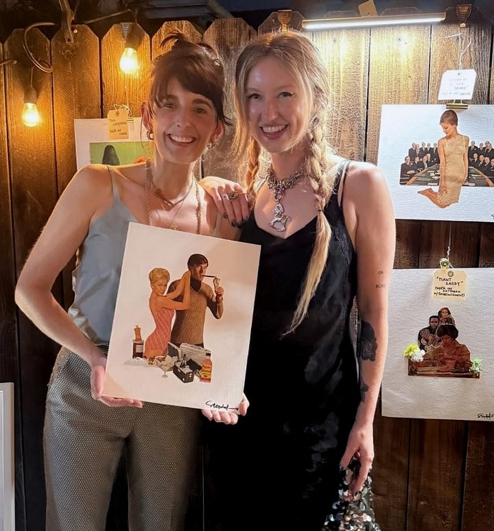 Scared I was gonna pass out since I had half of a heat stroke that day in my own damn house. Scared that the pages of my prized vintage magazines that comprise each collage would disintegrate. Scared people wouldn’t show up. Scared people would show up and I’d have boob sweat and rip my slacks down the ass because the air was so hot & thick it was like I dried them on high & ironed them directly onto my body.